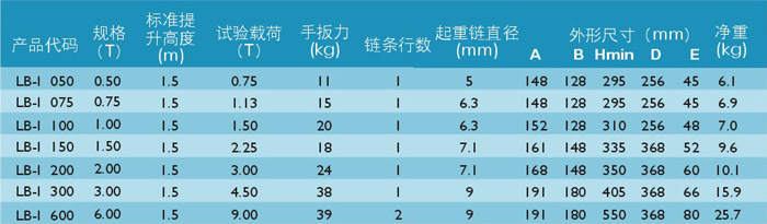 艾培爾LB-I型日本款式環鏈手扳葫蘆參數: