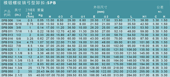 艾培爾SPB型6倍強力型卸扣參數: